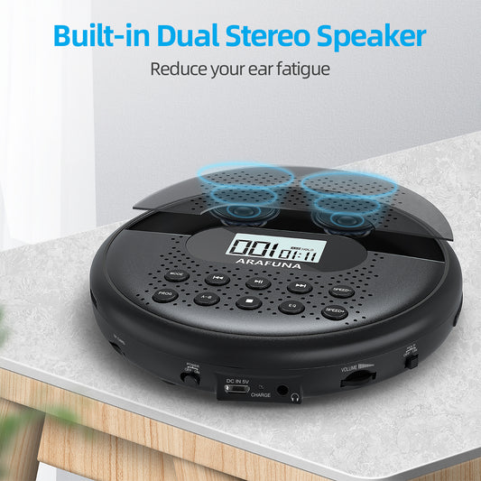 Portable CD Player with Dual Stereo Speakers, Rechargeable CD Player for Car with Anti-Skip Protection, Walkman CD Player with Headphones and AUX Cable
