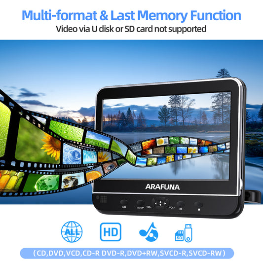 10.5" Dual Portable DVD Player, Arafuna Rechargable Car Screen Play A Same or Two Different Movies, Headrest for Car with 5-Hour Battery, Support USB/SD, Last Memory